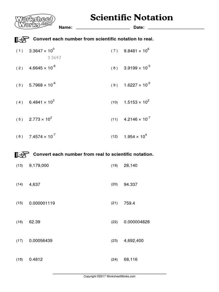 754 × 107 28 × scientific notation worksheet answers. If the number is in decimal notation, move the decimal point to the right of its original position and place it after .
